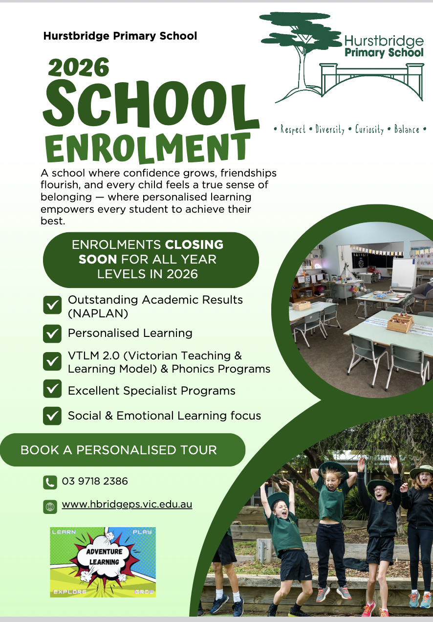 We welcome the opportunity to show you what Hurstbridge PS has to offer you and your child, and we extend an invitation to all parents considering a quality educational environment with a strong sense of community for their children to contact the school to arrange a personalised school tour.